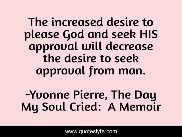 This page presents the quote "The increased desire to please God and seek HIS approval will decrease the desire to seek approval from man.". Author of this quote is Yvonne Pierre, The Day My Soul Cried: A Memoir. This quote is about desire, approval-of-others, pleasing-others, uplifting, people-pleasing, inspirational-attitude, inspirational, enthusiasm,.