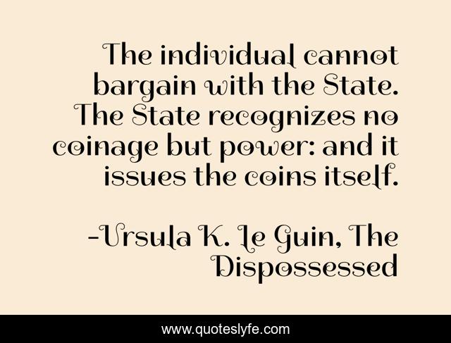 This page presents the quote "The individual cannot bargain with the State. The State recognizes no coinage but power: and it issues the coins itself.". Author of this quote is Ursula K. Le Guin, The Dispossessed. This quote is about politics, anarchism,.