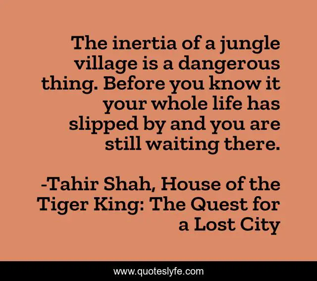 This page presents the quote "The inertia of a jungle village is a dangerous thing. Before you know it your whole life has slipped by and you are still waiting there.". Author of this quote is Tahir Shah, House of the Tiger King: The Quest for a Lost City. This quote is about danger, inertia, village, jungle, time,.