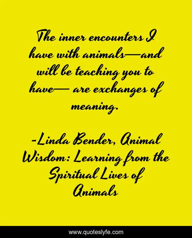 This page presents the quote "The inner encounters I have with animals—and will be teaching you to have— are exchanges of meaning.". Author of this quote is Linda Bender, Animal Wisdom: Learning from the Spiritual Lives of Animals. This quote is about communication, meaning, animals, spirituality,.