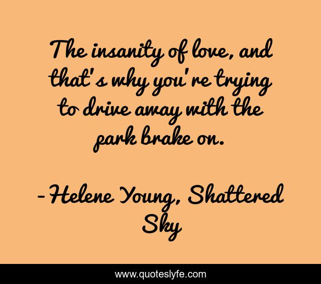 This page presents the quote "The insanity of love, and that’s why you’re trying to drive away with the park brake on.". Author of this quote is Helene Young, Shattered Sky. This quote is about romance, romantic-suspense,.