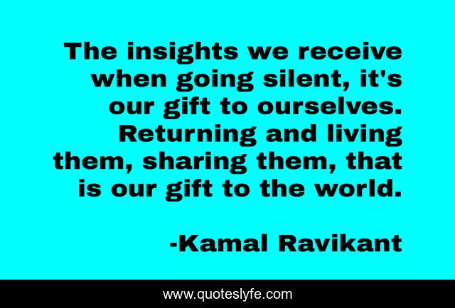 This page presents the quote "The insights we receive when going silent, it's our gift to ourselves. Returning and living them, sharing them, that is our gift to the world.". Author of this quote is Kamal Ravikant. This quote is about sharing, truth, insight, gifts, self-improvement, meditation-contemplation, silence,.