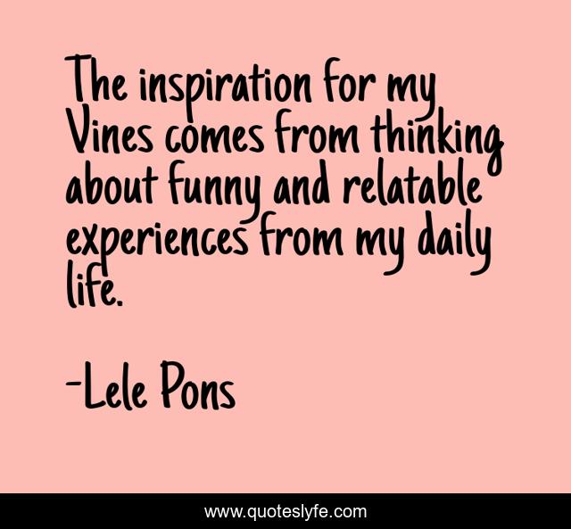 This page presents the quote "The inspiration for my Vines comes from thinking about funny and relatable experiences from my daily life.". Author of this quote is Lele Pons. This quote is about thinking, life, daily,.