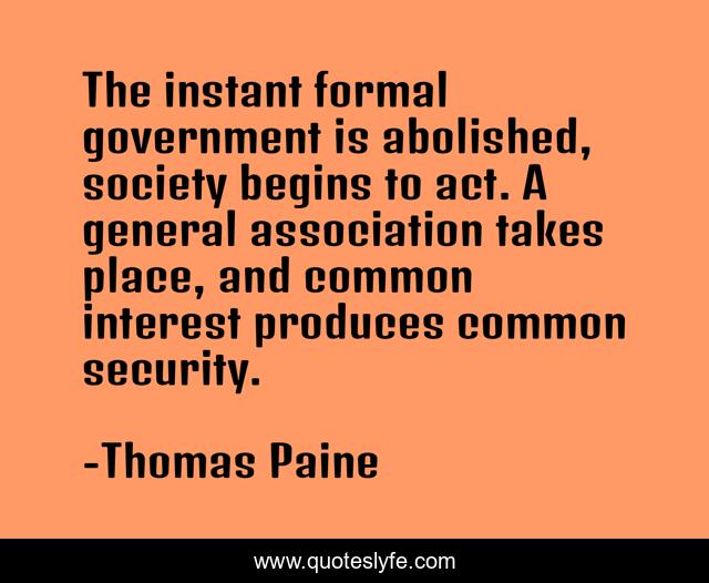 This page presents the quote "The instant formal government is abolished, society begins to act. A general association takes place, and common interest produces common security.". Author of this quote is Thomas Paine. This quote is about society, security, place,.