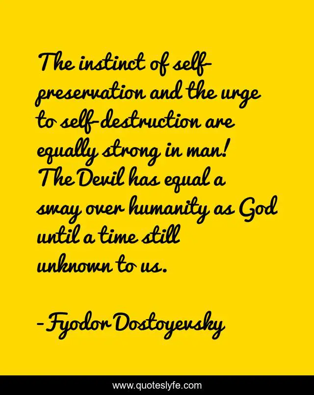 This page presents the quote "The instinct of self-preservation and the urge to self-destruction are equally strong in man! The Devil has equal a sway over humanity as God until a time still unknown to us.". Author of this quote is Fyodor Dostoyevsky. This quote is about god, devil, self-preservation, self-destruction,.