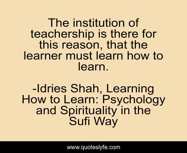 This page presents the quote "The institution of teachership is there for this reason, that the learner must learn how to learn.". Author of this quote is Idries Shah, Learning How to Learn: Psychology and Spirituality in the Sufi Way. This quote is about psychology, sufi, mind, sufism, learning, teaching, sufi-way,.