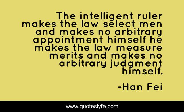 This page presents the quote "The intelligent ruler makes the law select men and makes no arbitrary appointment himself he makes the law measure merits and makes no arbitrary judgment himself.". Author of this quote is Han Fei. This quote is about law, intelligent, measure,.