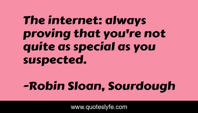This page presents the quote "The internet: always proving that you're not quite as special as you suspected.". Author of this quote is Robin Sloan, Sourdough. This quote is about individuality, internet,.