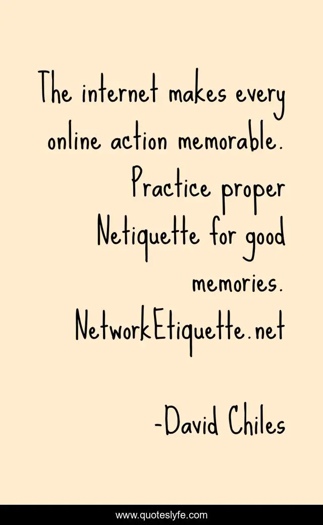 This page presents the quote "The internet makes every online action memorable. Practice proper Netiquette for good memories. NetworkEtiquette.net". Author of this quote is David Chiles. This quote is about etiquette, rules-for-netiquette, internet-etiquette, internet, netiquette-rules, manners, rules-of-netiquette, online, internet-manners,.