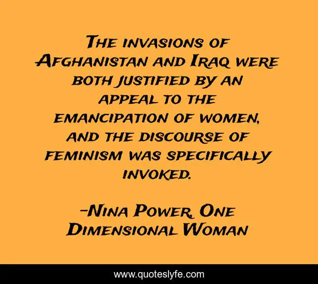 This page presents the quote "The invasions of Afghanistan and Iraq were both justified by an appeal to the emancipation of women, and the discourse of feminism was specifically invoked.". Author of this quote is Nina Power, One Dimensional Woman. This quote is about politics, feminism, politics-of-the-united-states,.