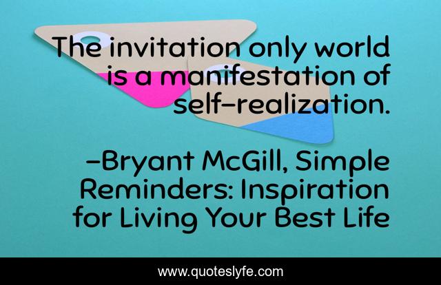 This page presents the quote "The invitation only world is a manifestation of self-realization.". Author of this quote is Bryant McGill, Simple Reminders: Inspiration for Living Your Best Life. This quote is about manifestation, invitation, realization,.