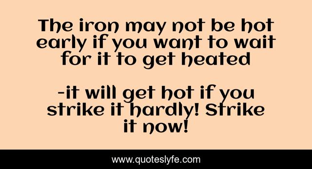 This page presents the quote "The iron may not be hot early if you want to wait for it to get heated". Author of this quote is it will get hot if you strike it hardly! Strike it now!. This quote is about israelmore ayivor, the great hand book of quotes,.
