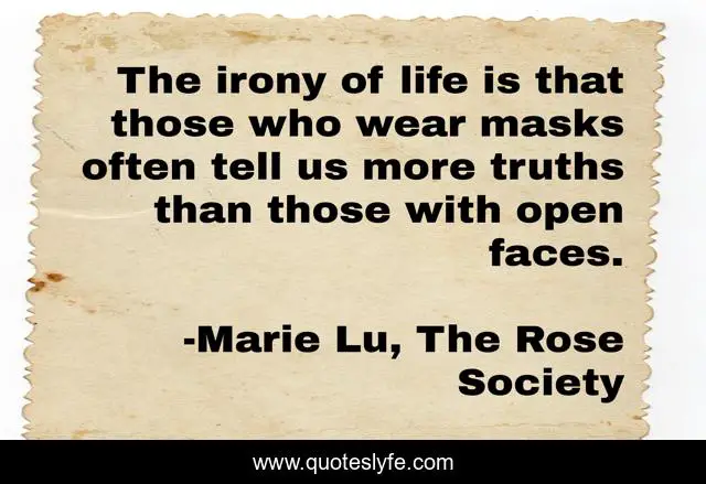 This page presents the quote "The irony of life is that those who wear masks often tell us more truths than those with open faces.". Author of this quote is Marie Lu, The Rose Society. This quote is about masks, irony, life, truth,.