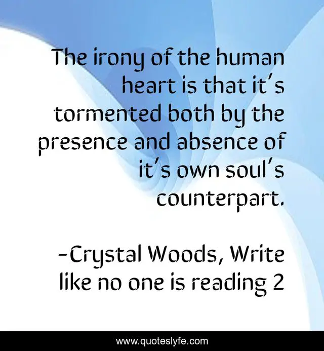 This page presents the quote "The irony of the human heart is that it’s tormented both by the presence and absence of it’s own soul’s counterpart.". Author of this quote is Crystal Woods, Write like no one is reading 2. This quote is about heartache, tormented-heart, tormented-mind, human, presence, human-nature, irony, counterpart, quotes,.