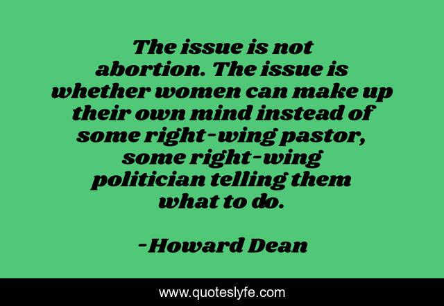 This page presents the quote "The issue is not abortion. The issue is whether women can make up their own mind instead of some right-wing pastor, some right-wing politician telling them what to do.". Author of this quote is Howard Dean. This quote is about mind, abortion, up,.