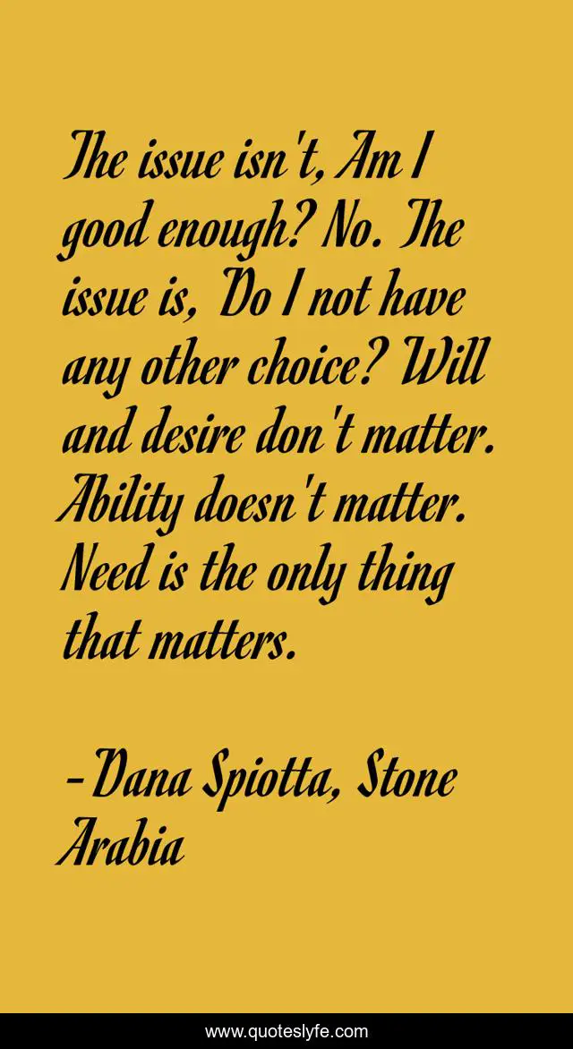 This page presents the quote "The issue isn't, Am I good enough? No. The issue is, Do I not have any other choice? Will and desire don't matter. Ability doesn't matter. Need is the only thing that matters.". Author of this quote is Dana Spiotta, Stone Arabia. This quote is about life, motivation,.