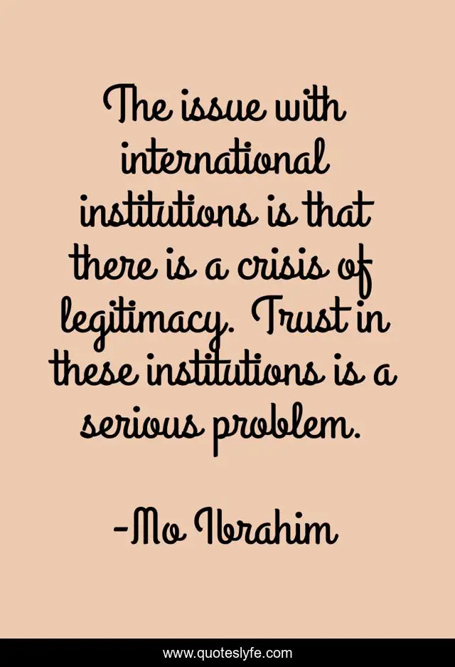 This page presents the quote "The issue with international institutions is that there is a crisis of legitimacy. Trust in these institutions is a serious problem.". Author of this quote is Mo Ibrahim. This quote is about serious, problem, crisis,.