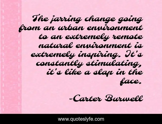 This page presents the quote "The jarring change going from an urban environment to an extremely remote natural environment is extremely inspiring. It's constantly stimulating, it's like a slap in the face.". Author of this quote is Carter Burwell. This quote is about environment, natural, face,.