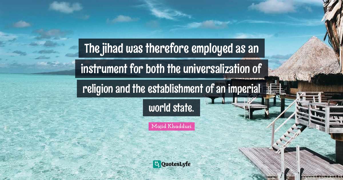 This page presents the quote "The jihad was therefore employed as an instrument for both the universalization of religion and the establishment of an imperial world state.". Author of this quote is Majid Khadduri. This quote is about world, establishment, employed, states, religion, jihad, instruments,.