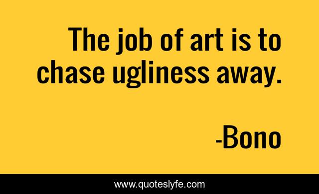 This page presents the quote "The job of art is to chase ugliness away.". Author of this quote is Bono. This quote is about ugliness, job, away,.