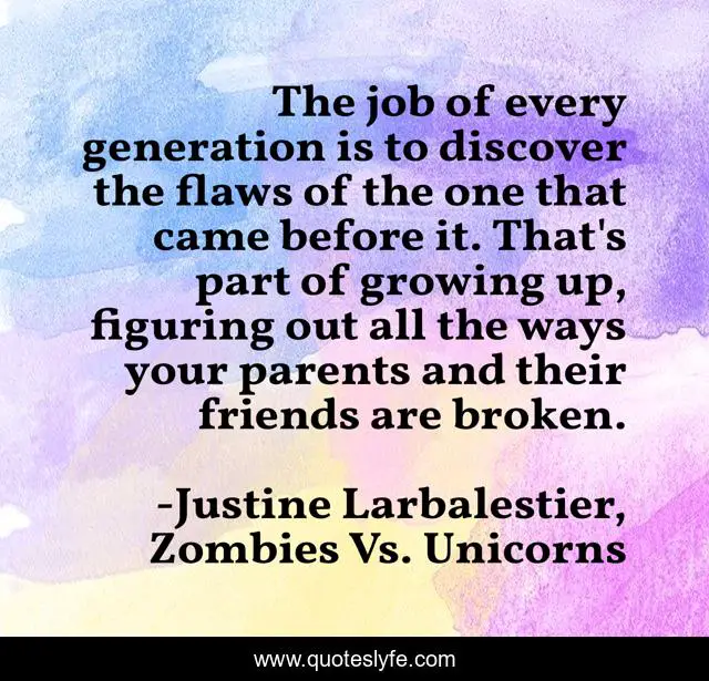 This page presents the quote "The job of every generation is to discover the flaws of the one that came before it. That's part of growing up, figuring out all the ways your parents and their friends are broken.". Author of this quote is Justine Larbalestier, Zombies Vs. Unicorns. This quote is about intergenerational-relations, human-nature, parents, children,.