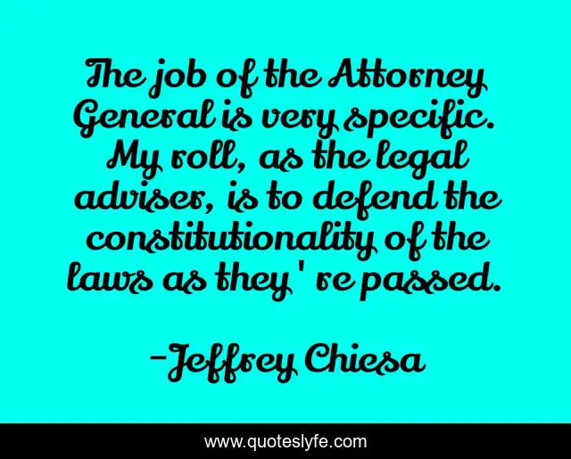 This page presents the quote "The job of the Attorney General is very specific. My roll, as the legal adviser, is to defend the constitutionality of the laws as they're passed.". Author of this quote is Jeffrey Chiesa. This quote is about job, laws, general,.