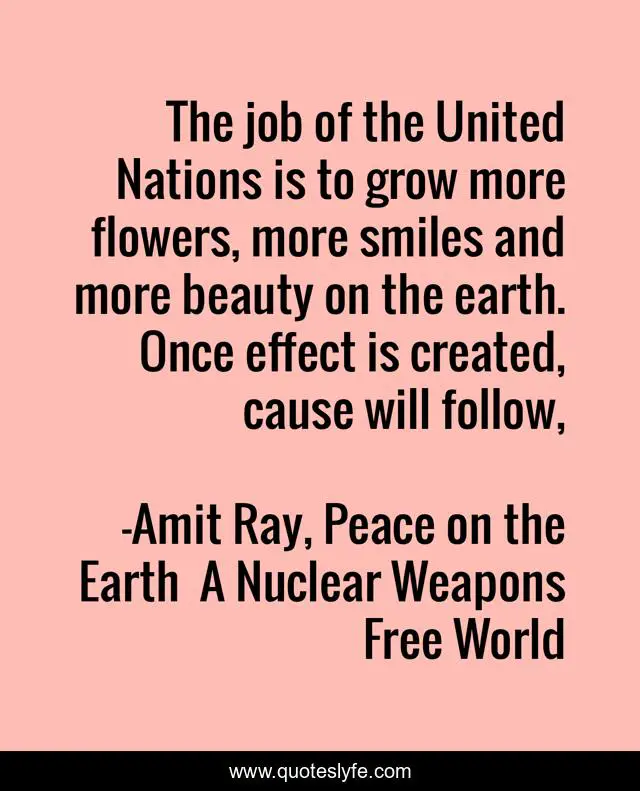 This page presents the quote "The job of the United Nations is to grow more flowers, more smiles and more beauty on the earth. Once effect is created, cause will follow, ". Author of this quote is Amit Ray, Peace on the Earth A Nuclear Weapons Free World. This quote is about beauty-in-nature, nuclear-power, nuclear-proliferation, peace-on-earth, beauty, disarmament, nuclear-war, cause-and-effect, world-peace,.