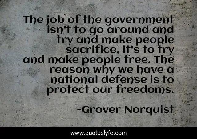 This page presents the quote "The job of the government isn't to go around and try and make people sacrifice, it's to try and make people free. The reason why we have a national defense is to protect our freedoms.". Author of this quote is Grover Norquist. This quote is about job, sacrifice, people,.