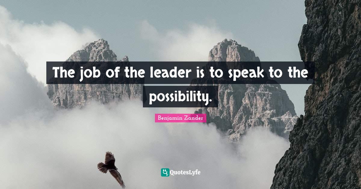 This page presents the quote "The job of the leader is to speak to the possibility.". Author of this quote is Benjamin Zander. This quote is about leader, speak, vision, jobs, possibility, leadership,.