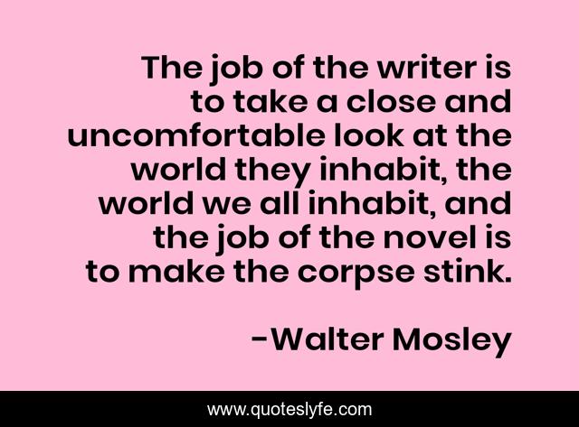 This page presents the quote "The job of the writer is to take a close and uncomfortable look at the world they inhabit, the world we all inhabit, and the job of the novel is to make the corpse stink.". Author of this quote is Walter Mosley. .
