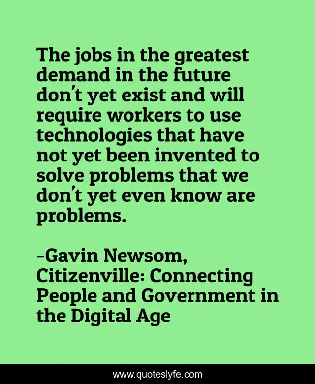 "Gavin Newsom, Citizenville: Connecting People and Government in the Digital Age Quotes." Quoteslyfe.com, 2025. Tue. 09 Dec. 2025. <https://www.quoteslyfe.com/quote/The-jobs-in-the-greatest-demand-in-241833>.