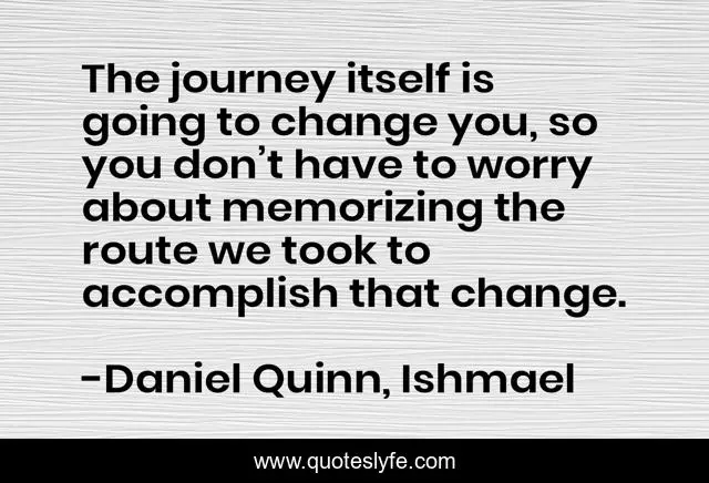 "Daniel Quinn, Ishmael Quotes." Quoteslyfe.com, 2025. Fri. 05 Dec. 2025. <https://www.quoteslyfe.com/quote/The-journey-itself-is-going-to-change-59565>.