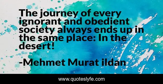 This page presents the quote "The journey of every ignorant and obedient society always ends up in the same place: In the desert!". Author of this quote is Mehmet Murat ildan. This quote is about deserts, ildan-wise-sayings, turkish, ildan-wisdom, turkish-playwrights, obedient, turkish-wisdom-words, society, ignorant-societies,.