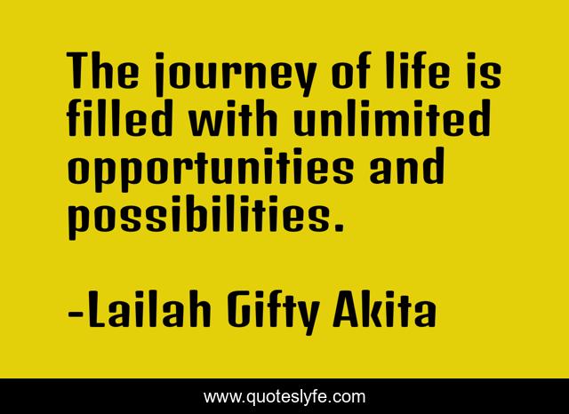 This page presents the quote "The journey of life is filled with unlimited opportunities and possibilities.". Author of this quote is Lailah Gifty Akita. This quote is about unlimited-power, life-and-living-insight, life-and-decisions, journeys, life-lesson, journey-to-yourself, unlimited, life, journey-in-life,.