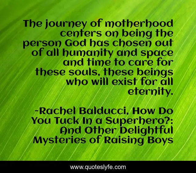 This page presents the quote "The journey of motherhood centers on being the person God has chosen out of all humanity and space and time to care for these souls, these beings who will exist for all eternity.". Author of this quote is Rachel Balducci, How Do You Tuck In a Superhero?: And Other Delightful Mysteries of Raising Boys. This quote is about moms, boys, motherhood, inspirational, enthusiasm,.
