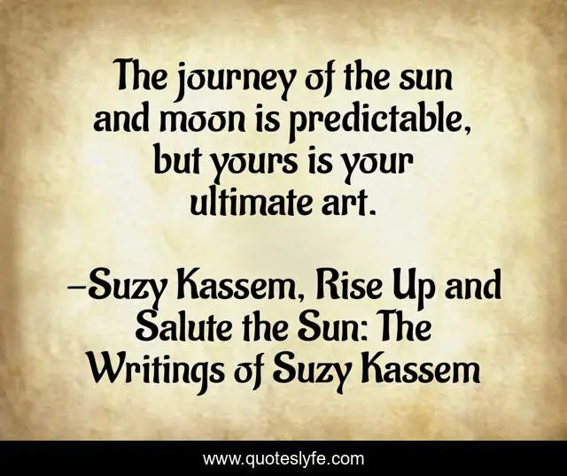 This page presents the quote "The journey of the sun and moon is predictable, but yours is your ultimate art.". Author of this quote is Suzy Kassem, Rise Up and Salute the Sun: The Writings of Suzy Kassem. This quote is about life, art, sun, moon, journey, purpose, suzy-kassem,.