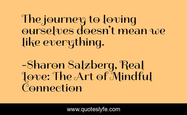 This page presents the quote "The journey to loving ourselves doesn’t mean we like everything.". Author of this quote is Sharon Salzberg, Real Love: The Art of Mindful Connection. This quote is about love, mindfulness, inspirational, enthusiasm, meditation, kindness, real-love, affection,.