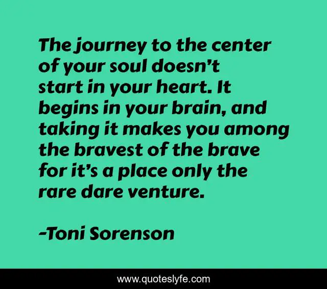 This page presents the quote "The journey to the center of your soul doesn’t start in your heart. It begins in your brain, and taking it makes you among the bravest of the brave for it’s a place only the rare dare venture.". Author of this quote is Toni Sorenson. This quote is about thinking, brain, life, thoughts, inspiration,.