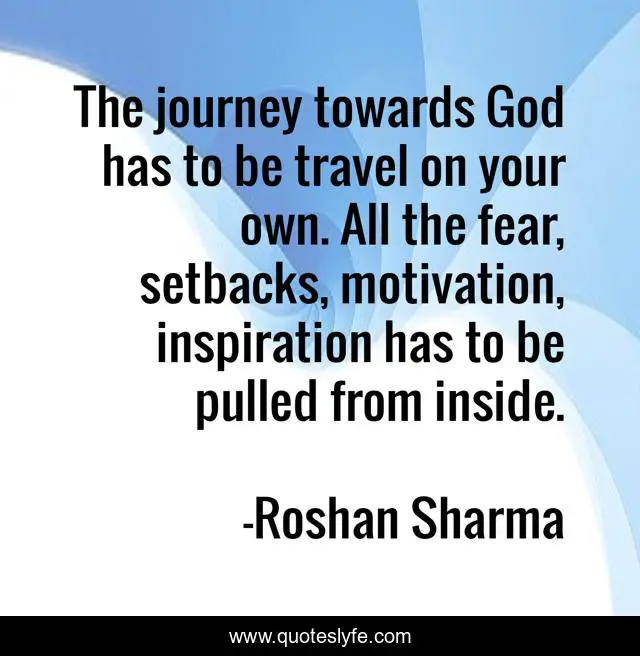 This page presents the quote "The journey towards God has to be travel on your own. All the fear, setbacks, motivation, inspiration has to be pulled from inside.". Author of this quote is Roshan Sharma. This quote is about god, fear, journey, motivation, inspiration,.