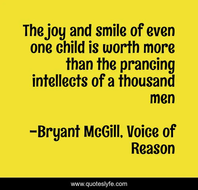 This page presents the quote "The joy and smile of even one child is worth more than the prancing intellects of a thousand men". Author of this quote is Bryant McGill, Voice of Reason. This quote is about inspiring, happiness, truth,.