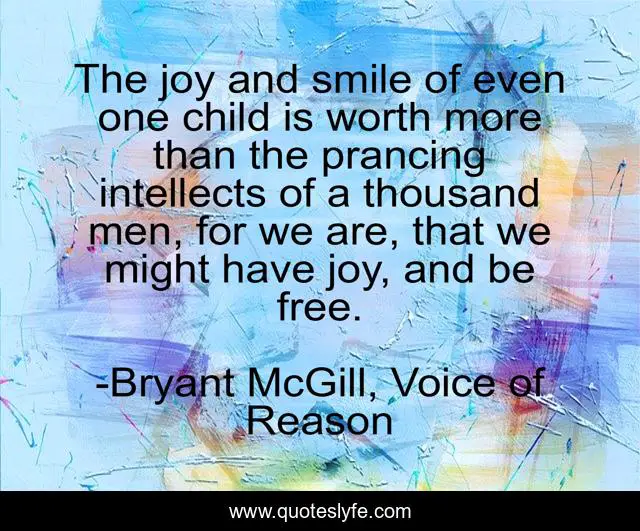 This page presents the quote "The joy and smile of even one child is worth more than the prancing intellects of a thousand men, for we are, that we might have joy, and be free.". Author of this quote is Bryant McGill, Voice of Reason. This quote is about joy, pleasure, happiness, smile,.
