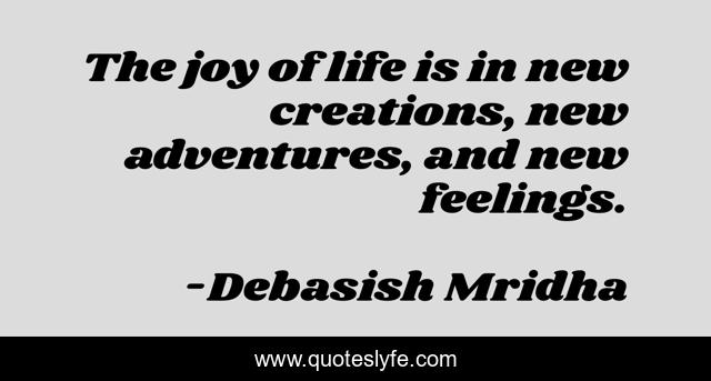 This page presents the quote "The joy of life is in new creations, new adventures, and new feelings.". Author of this quote is Debasish Mridha. This quote is about new-feelings, miraboli, new-adventures, inspirational, oscar-wilde, philosophy, debasish-mridha, tagore, joy-of-life,.