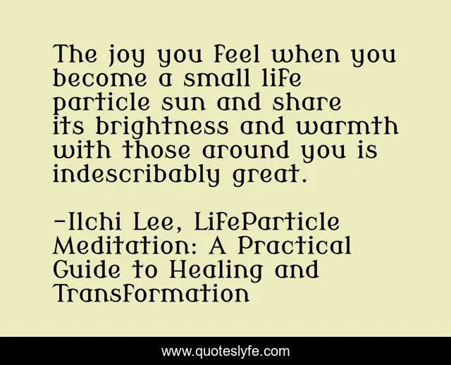 This page presents the quote "The joy you feel when you become a small life particle sun and share its brightness and warmth with those around you is indescribably great.". Author of this quote is Ilchi Lee, LifeParticle Meditation: A Practical Guide to Healing and Transformation. This quote is about joy, brightness, sun,.