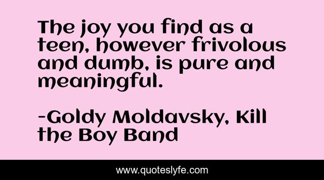 This page presents the quote "The joy you find as a teen, however frivolous and dumb, is pure and meaningful.". Author of this quote is Goldy Moldavsky, Kill the Boy Band. This quote is about teen, joy, pure, happy,.