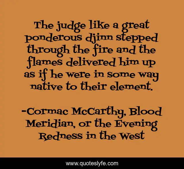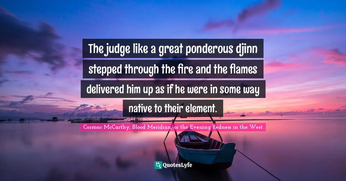 This page presents the quote "The judge like a great ponderous djinn stepped through the fire and the flames delivered him up as if he were in some way native to their element.". Author of this quote is Cormac McCarthy, Blood Meridian, or the Evening Redness in the West. .