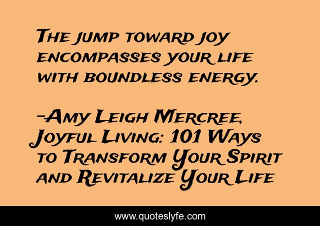 This page presents the quote "The jump toward joy encompasses your life with boundless energy.". Author of this quote is Amy Leigh Mercree, Joyful Living: 101 Ways to Transform Your Spirit and Revitalize Your Life. This quote is about jump-with-joy, life, quotes-de-la-vida, amy-leigh-mercree, joy, boundless-heart, joyful-living, quotes-tumblr, joyful-living-101,.