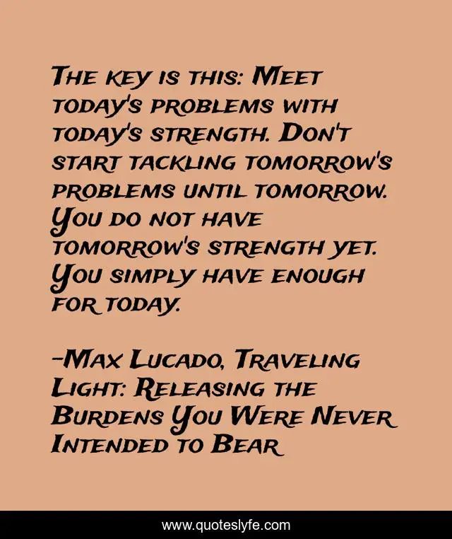 This page presents the quote "The key is this: Meet today's problems with today's strength. Don't start tackling tomorrow's problems until tomorrow. You do not have tomorrow's strength yet. You simply have enough for today.". Author of this quote is Max Lucado, Traveling Light: Releasing the Burdens You Were Never Intended to Bear. This quote is about strength, problems, worrying, day-by-day,.