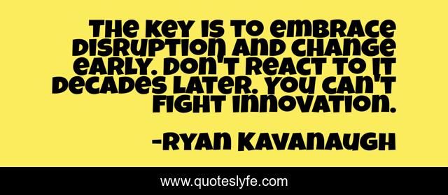 This page presents the quote "The key is to embrace disruption and change early. Don't react to it decades later. You can't fight innovation.". Author of this quote is Ryan Kavanaugh. This quote is about innovation, fight,.