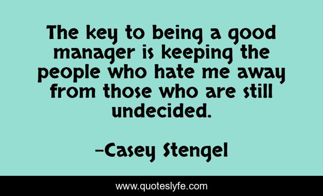 This page presents the quote "The key to being a good manager is keeping the people who hate me away from those who are still undecided.". Author of this quote is Casey Stengel. This quote is about me, good, hate,.