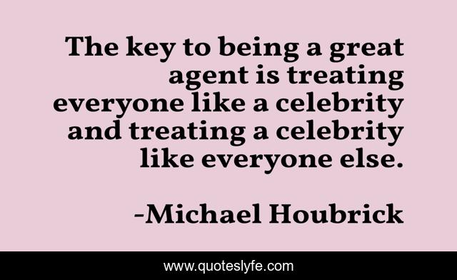 This page presents the quote "The key to being a great agent is treating everyone like a celebrity and treating a celebrity like everyone else.". Author of this quote is Michael Houbrick. This quote is about humor, author, celebrities, agent, manager, hollywood,.